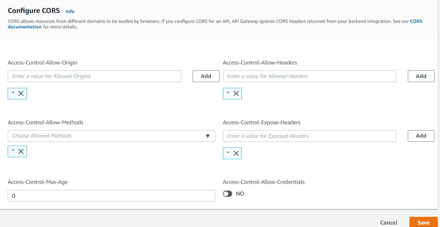Now that we have created our API, lets finish configuring it. The first thing we will want to do is set up the CORS settings, which will determine which origins are able to access this API. If you are accessing your API from a website you are running, then you will most likely want to only have your API accessible from that website in order to improve security. For this tutorial we will go with a much simpler configuration which allows access from all origins, using the "*" wildcard.