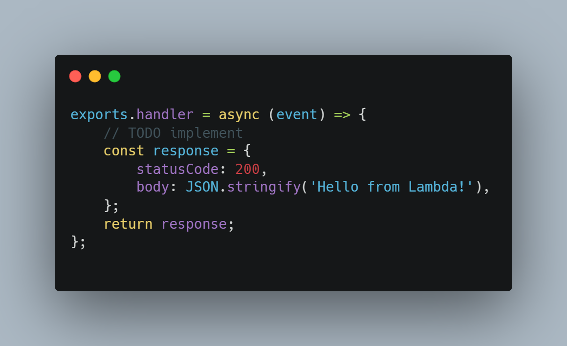 This function is quite simple. the event parameter is an object which contains the information that is being passed into your function; which in our case will also contain the data being sent to your API. This function then creates a response object with a statusCode variable inside which stores the status code being returned. Inside, there is also a body variable which stores the actual response.